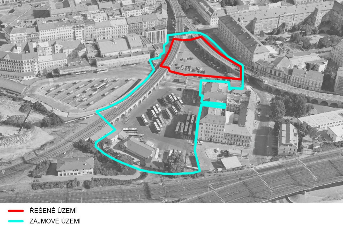 The area of the proposed area is subject to a requirement for an architectural design for a temporary check-in hall and facilities of the Florenc bus terminal, which will include a public part designed for approximately 26,000 people per day, offering waiting areas, catering services, pre-sales offices of transport companies, luggage storage, etc. The non-public part will mainly include the operational and administrative facilities of the facility. The competition also includes a design for smaller structures for roofing individual platforms within the area of interest and a concept for using the space under the arches of the Negrelli Viaduct.